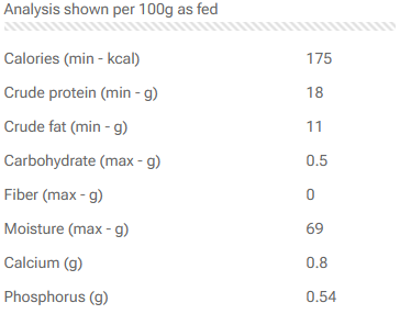 Beef, pork heart, beef liver, cranberries, beef spleen, spinach, broccoli, zucchini, beef kidney, monocalcium phosphate, blueberries, calcium carbonate, cod liver oil, kelp, barley grass, wheat grass, salt, docosahexaenoic acid (DHA), magnesium sulphate, zinc proteinate, manganese proteinate, copper proteinate, vitamin E (a-tocopherol acetate).